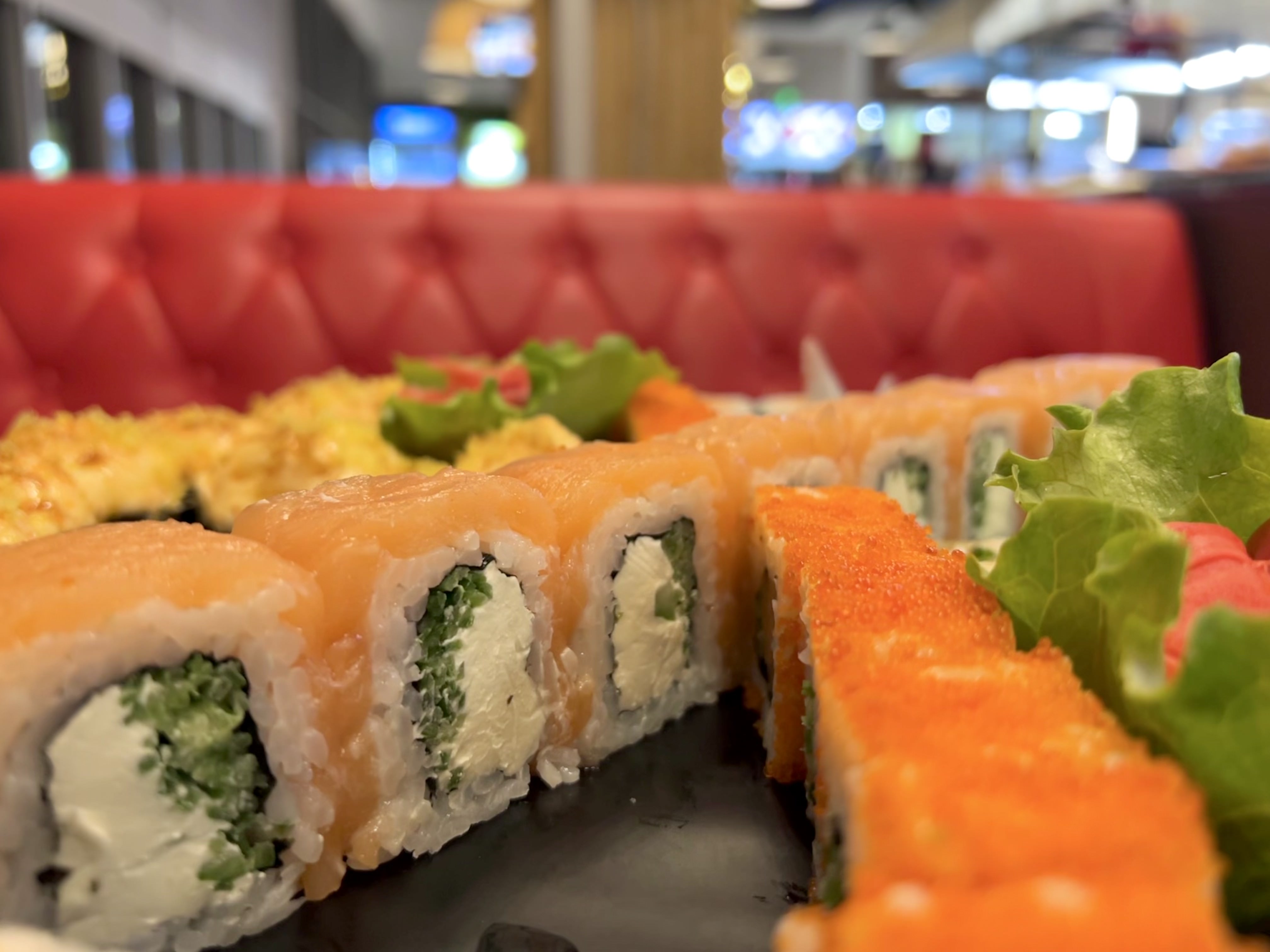 Заведение вмещает в себя 5 столиков в ярких оттенках, открытую кухню и вид на город из панорамных окон. На стороне ближе к фуд-корту стоят барные стулья, где можно присесть, выбрать готовые роллы и перекусить.